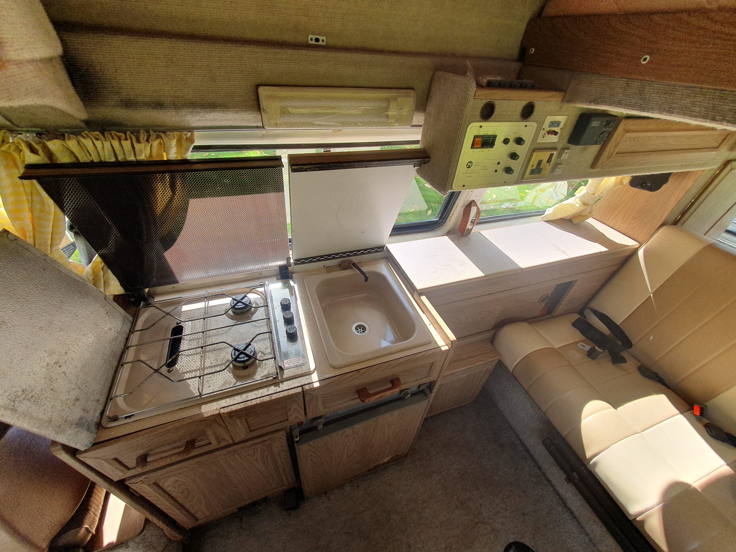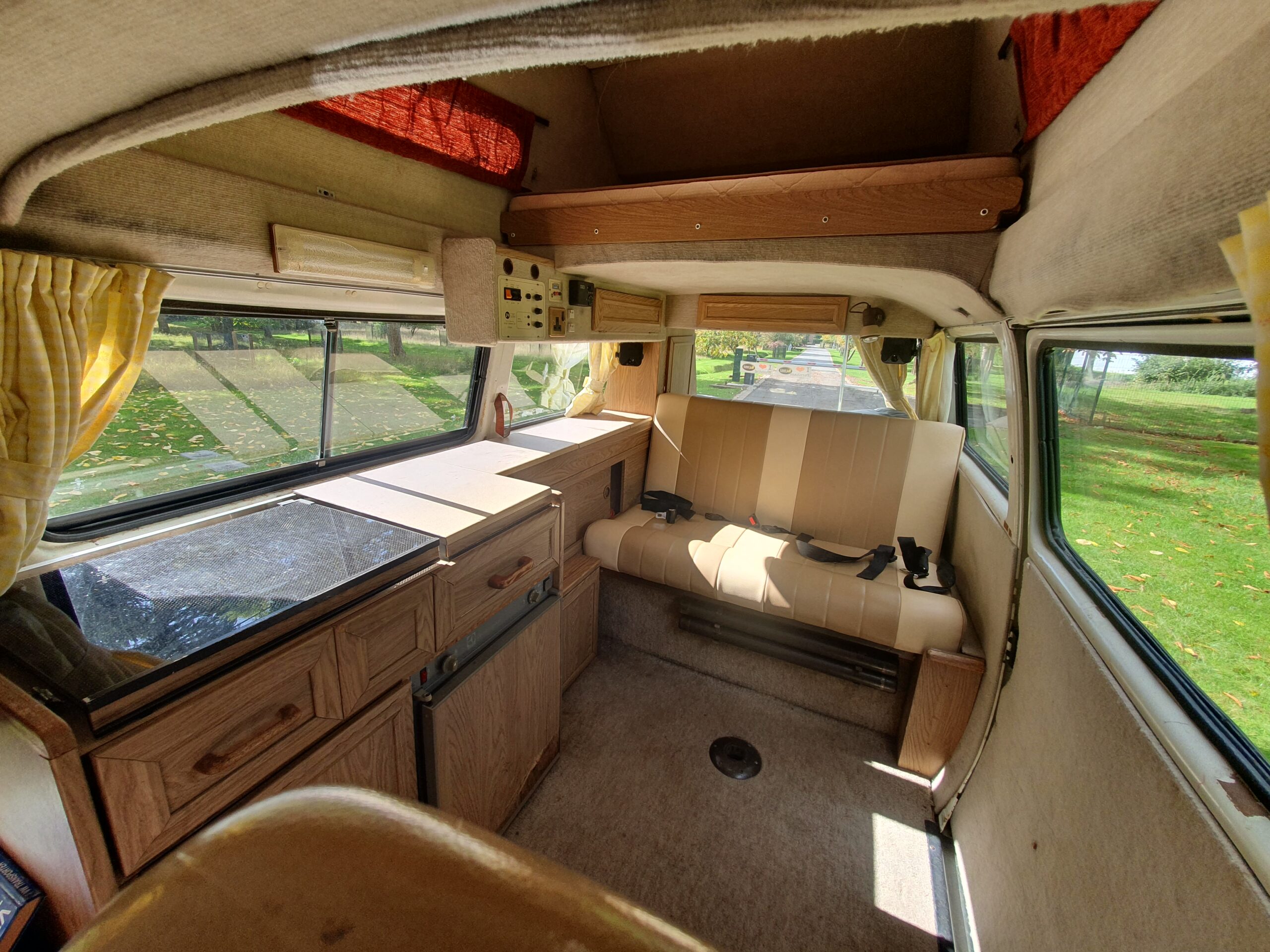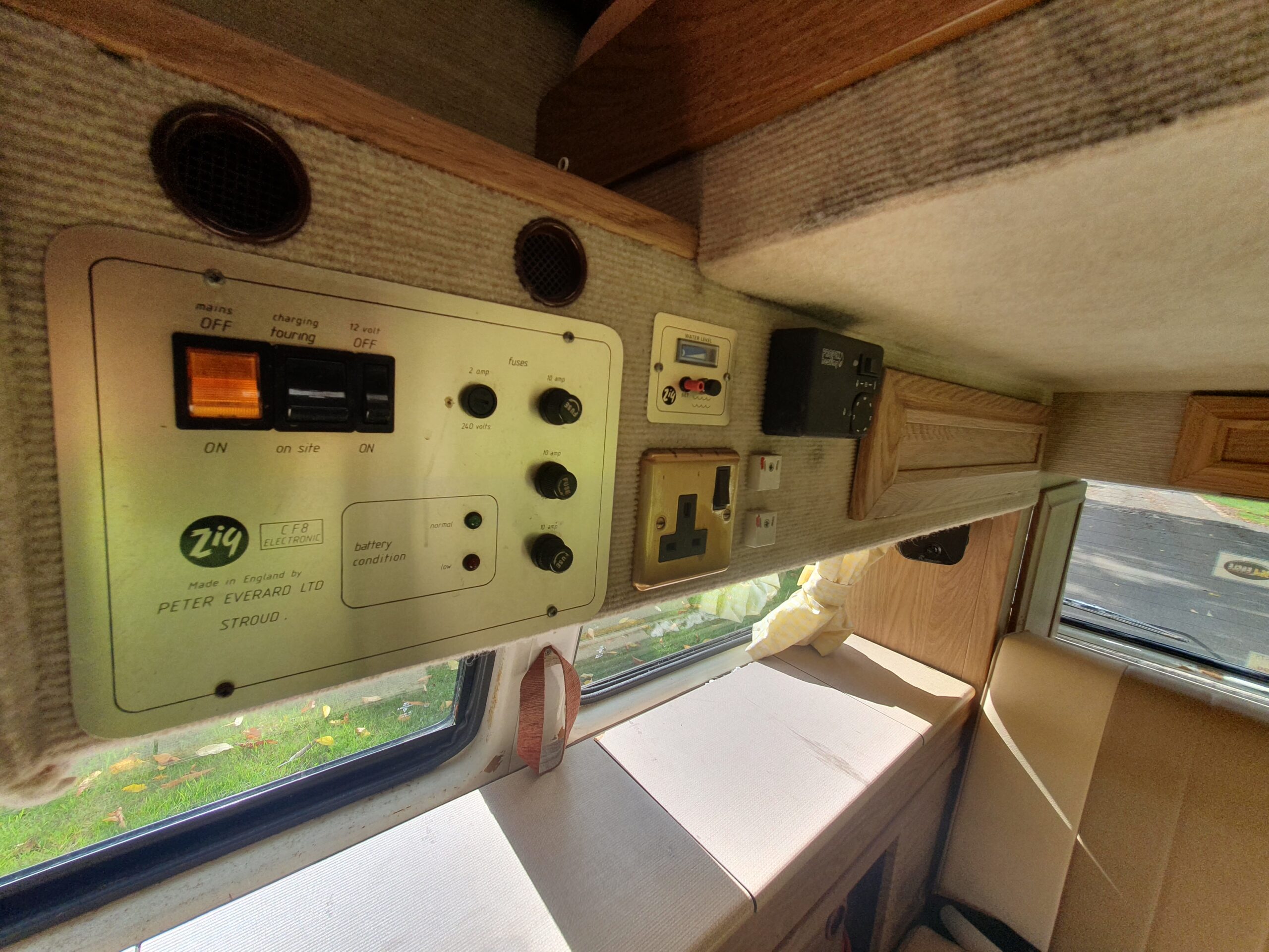 In 2010 she had a reconditioned engine fitted, and this has clocked in the region of 50, 000 miles. Originally white, in 2017 we had her resprayed two tone Pearl White and Cream as well the ‘rock n roll bed’ upholstered to match. The side window seals were also changed at this point and the fuel tank and fuel lines had significant work in 2022.